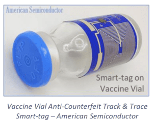 Many articles have recently come out about counterfeit Covid vaccines, with labels printed to look exactly like the legitimate vaccines. This makes it very difficult for pharmacies and medical centers to differentiate the real from the fake. American Semiconductor (ASI) has developed “a thin electronic system based on Semiconductor-on-Polymer™ (SoP) advanced packaging. The new tag can be applied as an adhesive label and includes an ultra-thin high-performance SoP chip. The smart-tag’s programmable capability implements rolling encryption codes that can authenticate individual vaccine vials at any time using a smartphone. The new programmable label technology includes serialization for each vial and the ability to track and trace vaccine vials from first bottling through last use. The smart-tags are based on near field communications (NFC) and require no battery so they have almost unlimited shelf life.” Click here to read the full article from ASI.